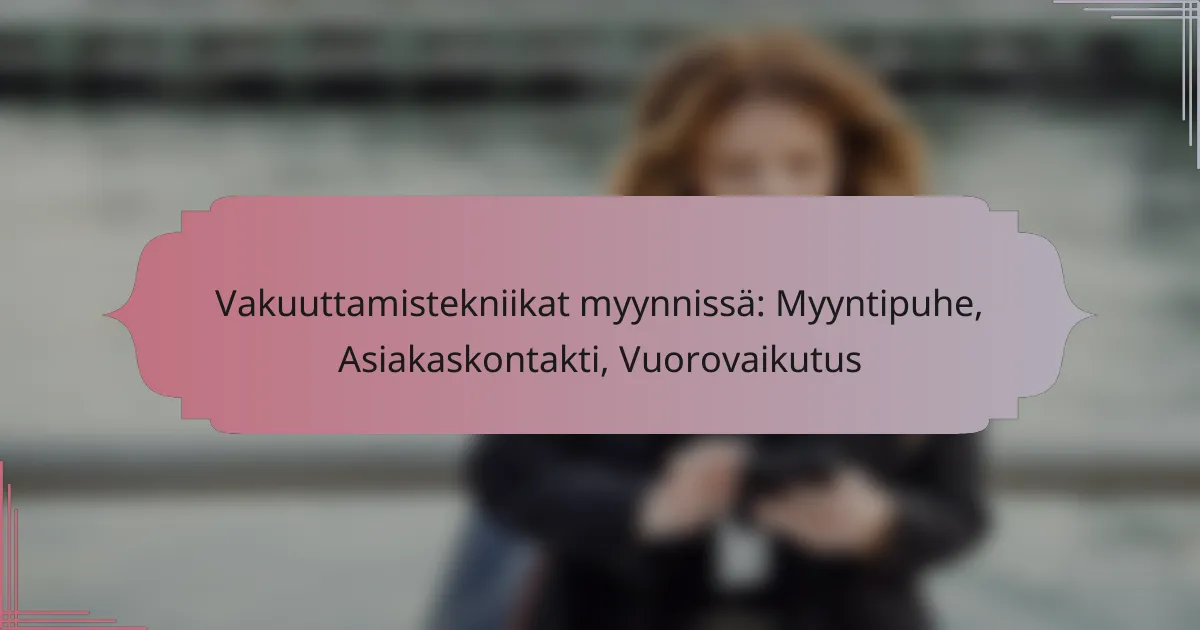 Vakuuttamistekniikat myynnissä ovat menetelmiä, joiden avulla myyjät voivat vaikuttaa asiakkaidensa päätöksentekoon. Tärkeimpiä elementtejä ovat myyntipuhe, asiakaskontakti ja vuorovaikutus, jotka yhdessä luovat tehokkaan myyntiprosessin.