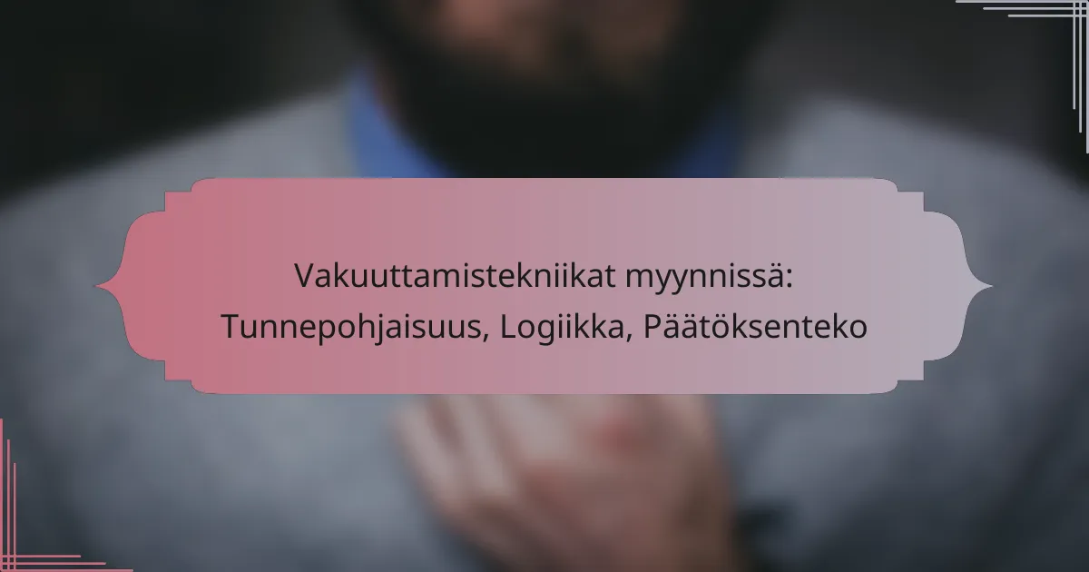 Vakuuttamistekniikat myynnissä yhdistävät tunteet, logiikan ja päätöksentekoprosessin, mikä on olennaista asiakassuhteiden rakentamisessa ja myyntitulosten parantamisessa. Tunteiden tunnistaminen myyntitilanteessa auttaa myyjiä mukauttamaan lähestymistapaansa, kun taas logiikkapohjaiset argumentit tarjoavat asiakkaille järkeviä perusteluja päätöksenteon tueksi.